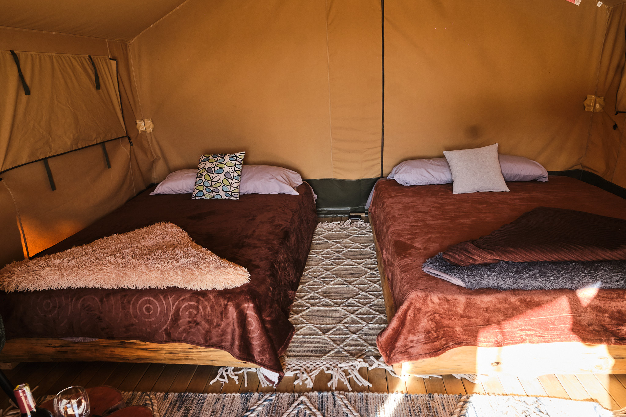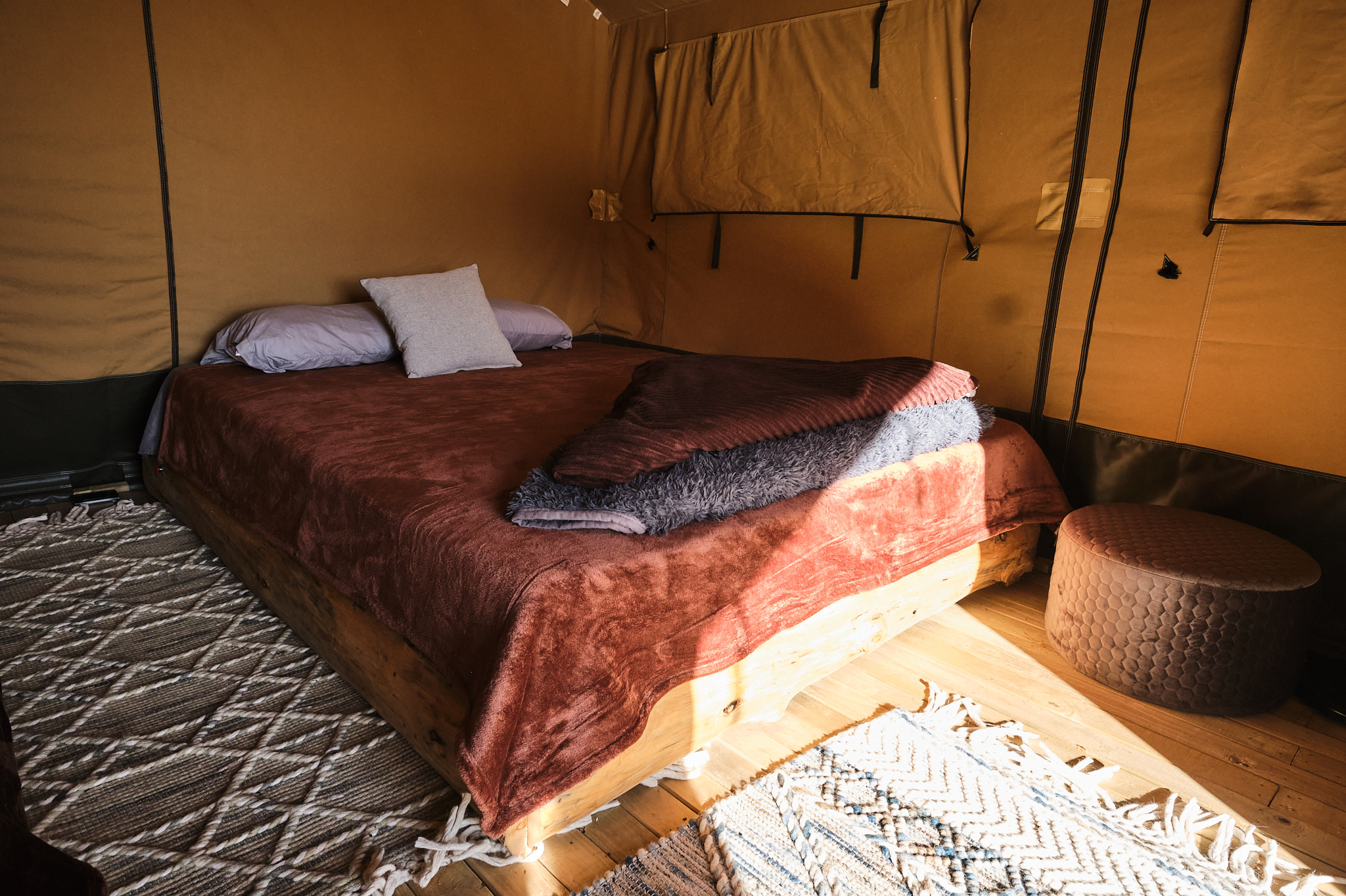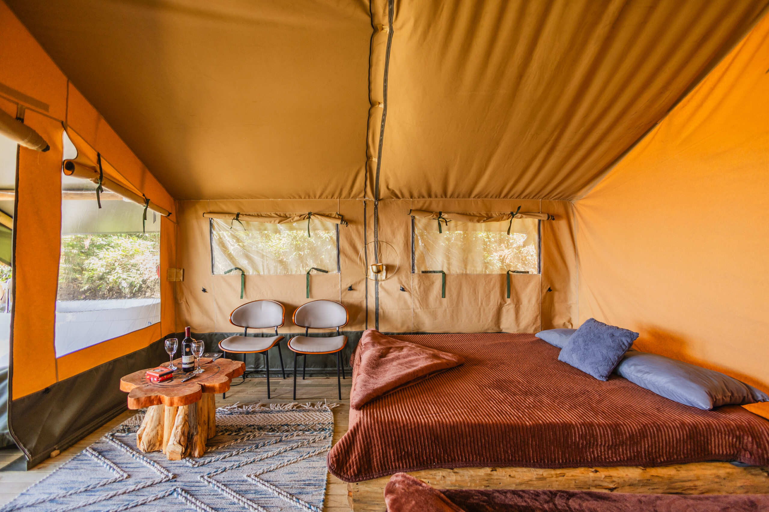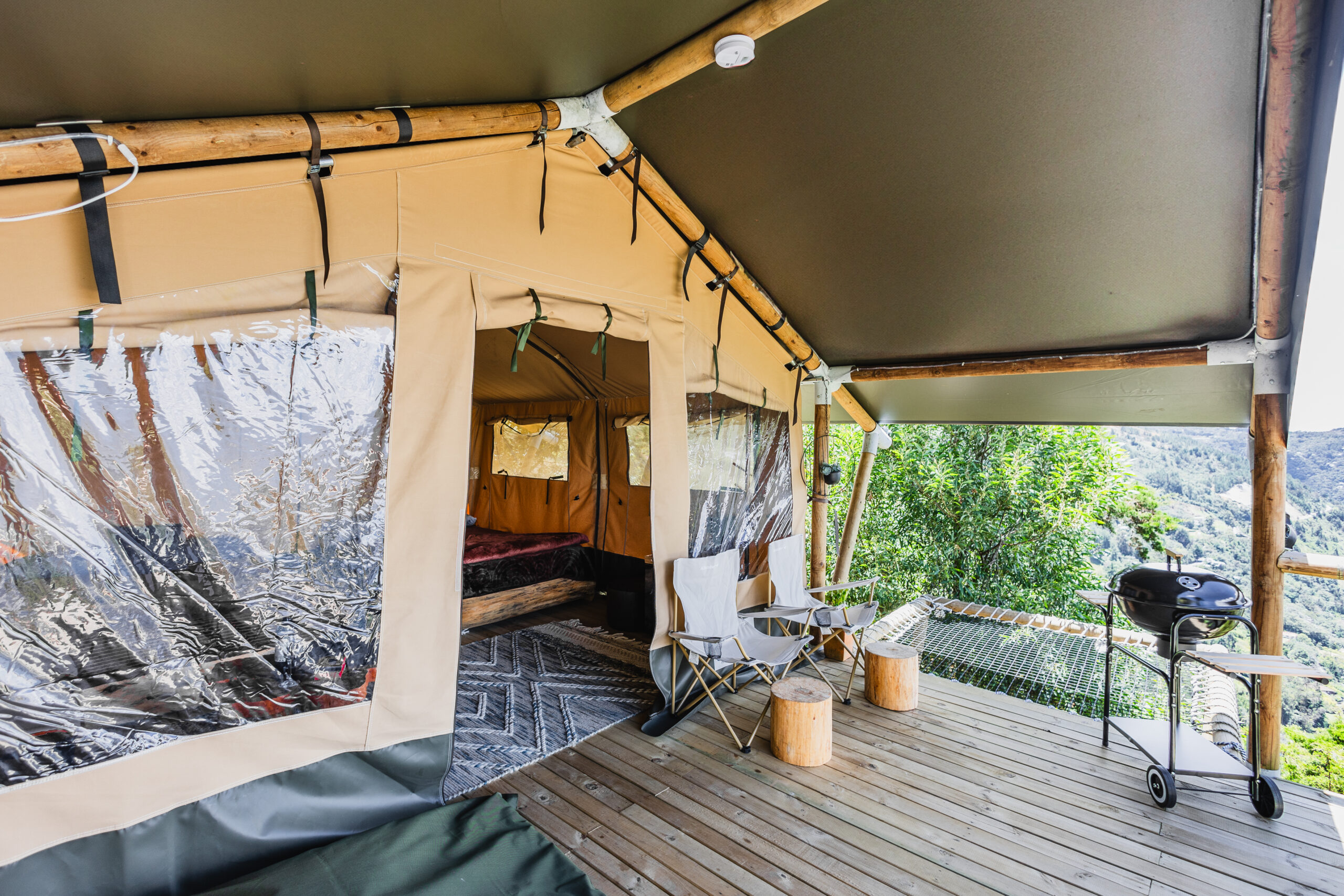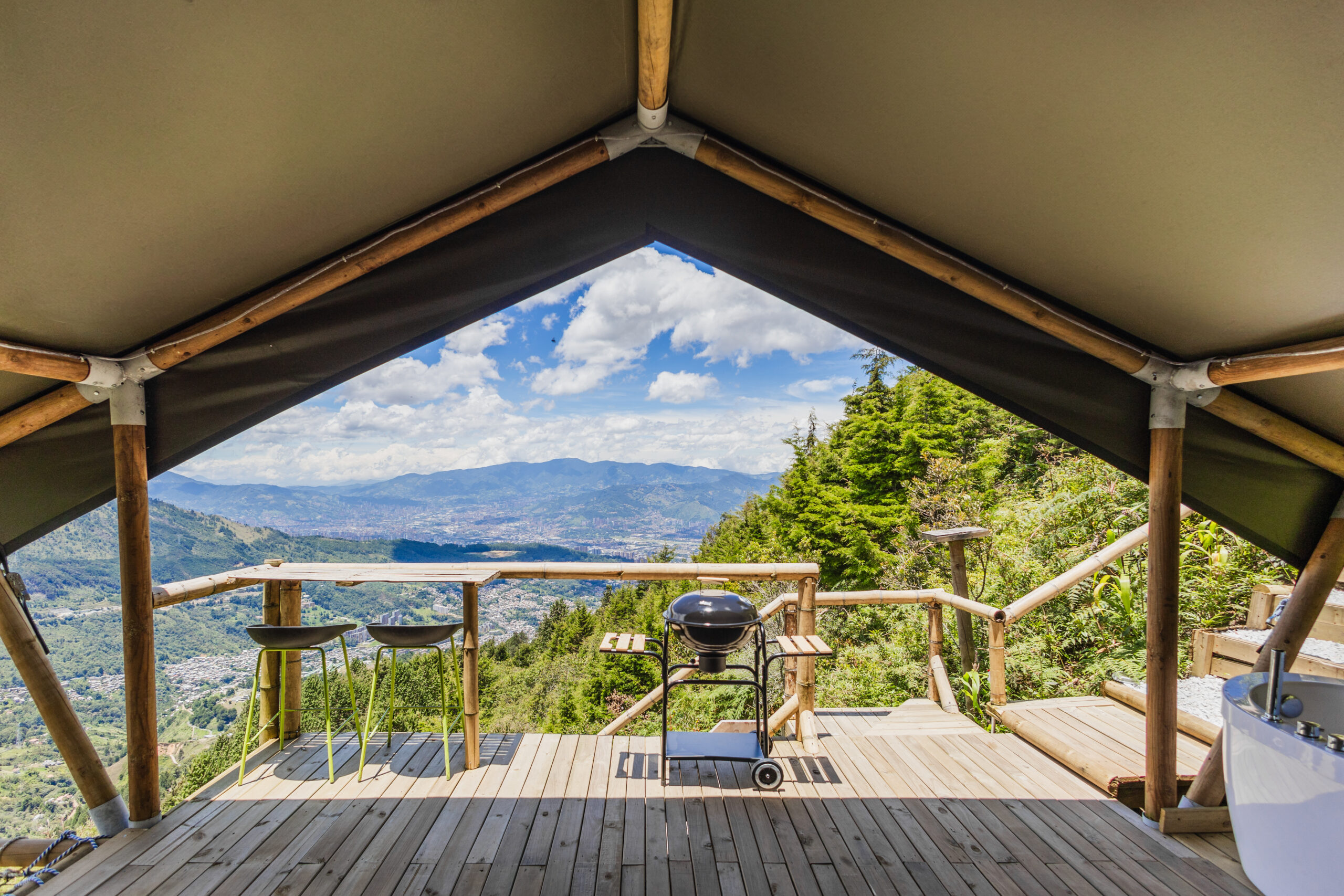 Luxurious glamping with 2 beds, a bathroom, a catamaran-style net, and a beautiful view of the city.